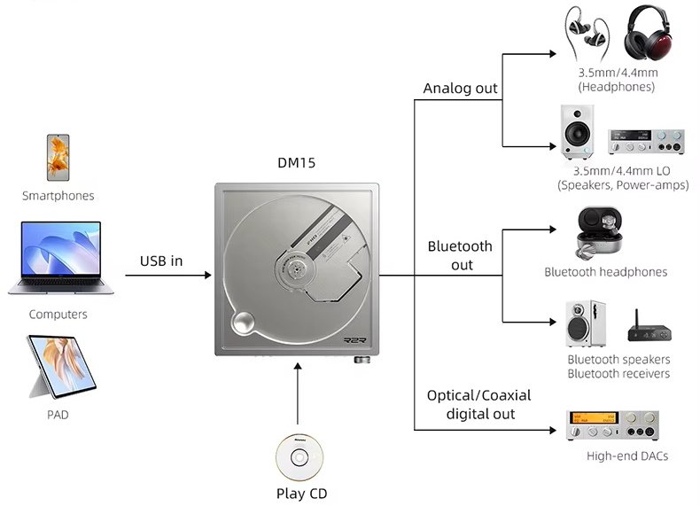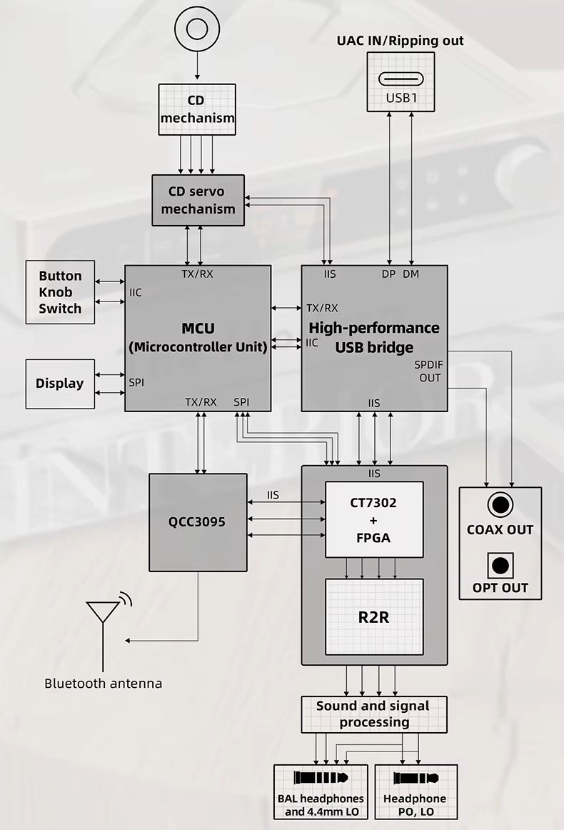The DM15 R2R represents a breakthrough, combining a smaller footprint with an even stronger feature set. Packed into its portable chassis are five core pillars: the CD Servo, USB DAC, R2R Module, and Bluetooth Module, all managed and coordinated by an MCU (microcontroller unit). Such a thorough “core” evolution elevates the device in every way, surpassing the competition in its product category.