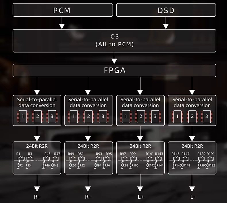 In order to recapture the classic audio character of vintage portable CD players, the DM15 R2R is equipped with a proprietary four-channel, fully differential 24Bit R2R resistor arrays DAC. It is built using a grand total of 192 precision thin-film resistors (48 per channel), carefully selected for their 0.1% accuracy and low temperature drift (30ppm). The result is a nuanced, warm, and organic analogue sound.