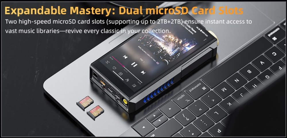 Most of today's music players are equipped with a single microSD card slot. The FiiO M27 packs in two slots, with each slot supporting microSD cards up to 2TB. Additionally, FiiO also have 256GB internal storage. Even if you plan to carry thousands of high-resolution audio tracks, M27 will always have enough room for you. (MicroSD cards not included).