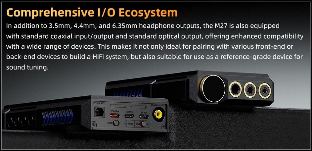 FiiO M27 has three headphone output ports; it supports 6.35mm, 4.4mm, and 3.5mm terminated headphones. Additionally, the M27 also has a coaxial input/output port and an Optical output port. FiiO M27 fits into different use scenarios with its versatile connectivity.