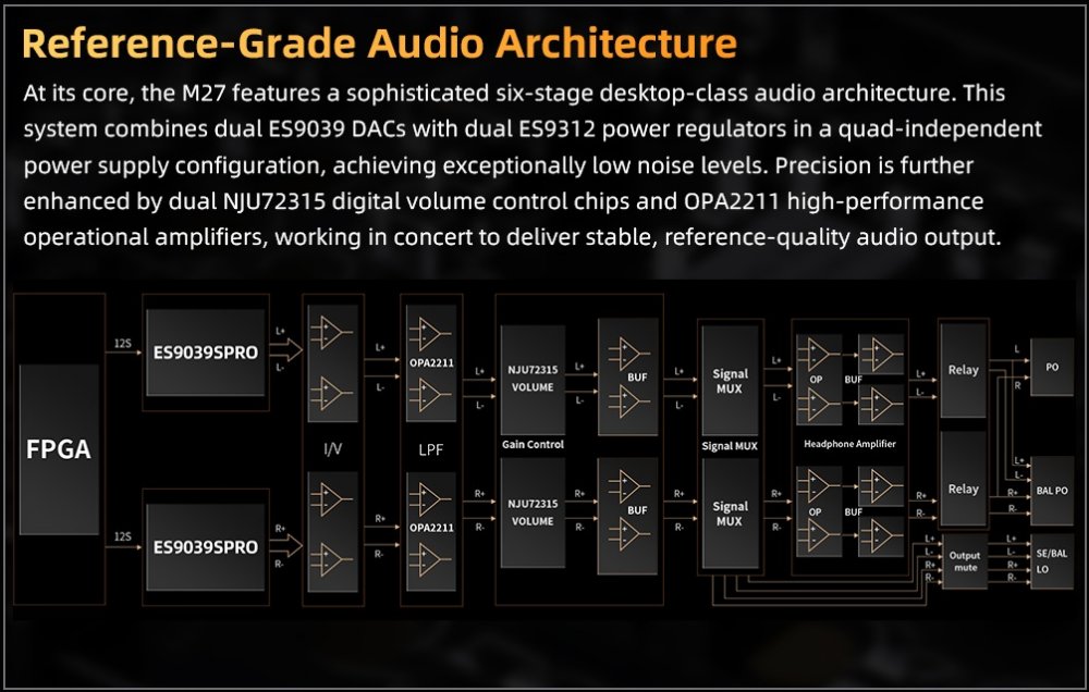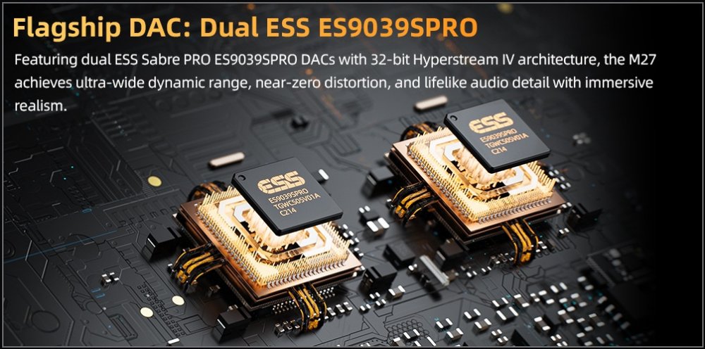 FiiO M27 offers nothing less than ultimate performance. It houses a dual-DAC setup featuring flagship ES9039S PRO DAC chips. These are true 32-bit DAC chips that unlock outstanding clarity and offer crisp, high-resolution audio signal processing with ultra-low noise and high DNR, SNR performance. This dual DAC arrangement ensures both PCM and DSD signals are processed with full precision.