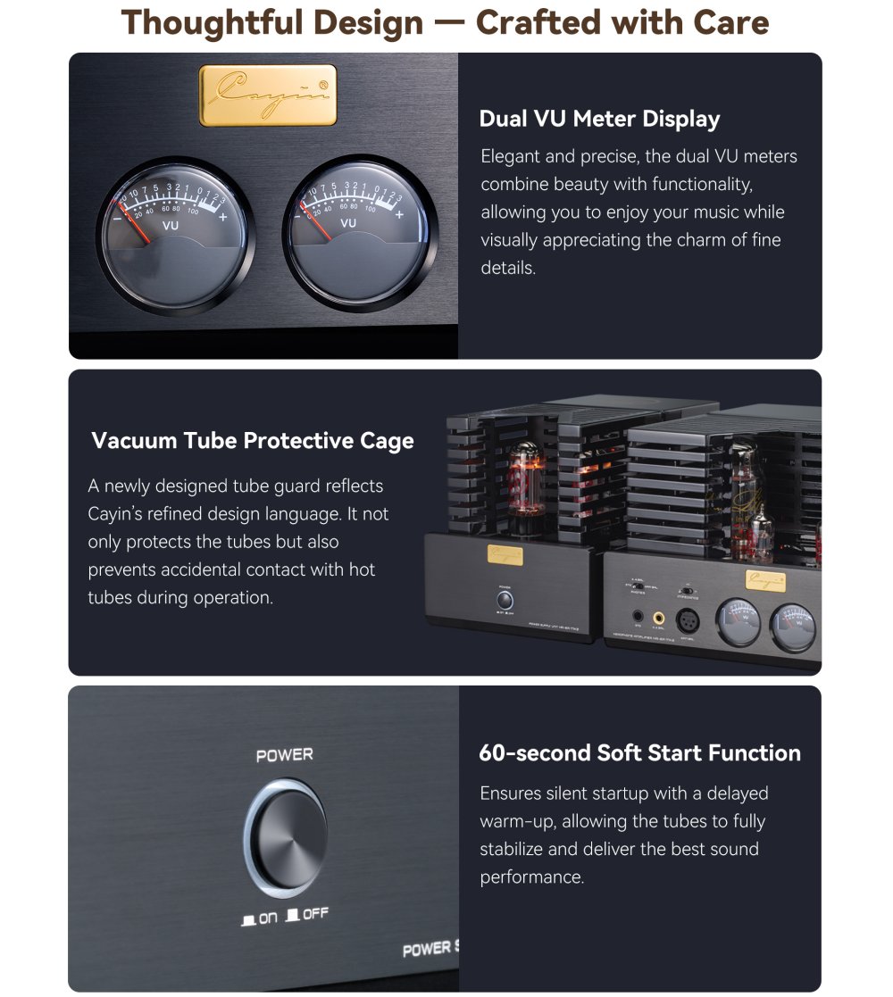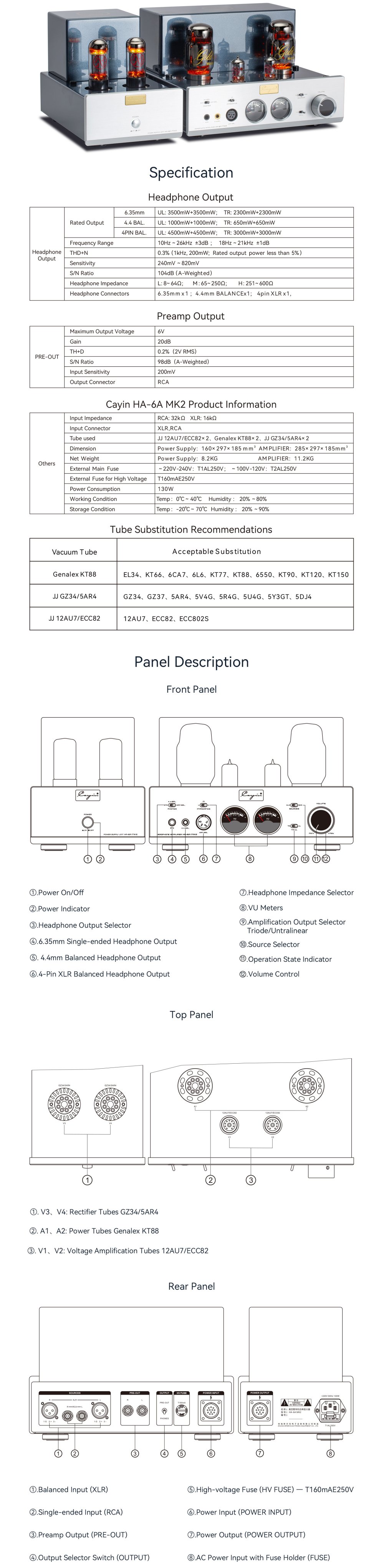 The Cayin HA-6A MK2 is a meticulously engineered single-ended Class A headphone amplifier powered by KT88 output tubes. The driver tubes amplify signal voltage under highly linear conditions, while the K188 tubes deliver complete, undivided output for maximum musical integrity. Cayin engineers carefully designed the gain circuitry, independently adjusting the operation current of each vacuum tube stage and pairing it with a pure, stable power supply. This ensures the HA-6A MK2 fully expresses the rich tonality and musical depth that single-ended Class A design is renowned for.