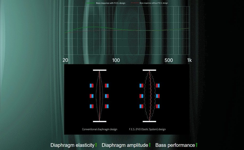 FiiO JT7 features FiiO’s self-developed F.E.S(FiiO Elastic System) design on the driver diaphragm. It incorporates multi-dimensional textures on the surface, which are similar to the surround ring textures on a dynamic driver. This unique and innovative technology increases the diaphragm’s elasticity. Compared to traditional planar drivers, this innovation allows for precise control over internal stress, resulting in swifter movement, ensuring rich and dynamic bass response. The bass is punchier and has lower distortion compared to traditional planar drivers.