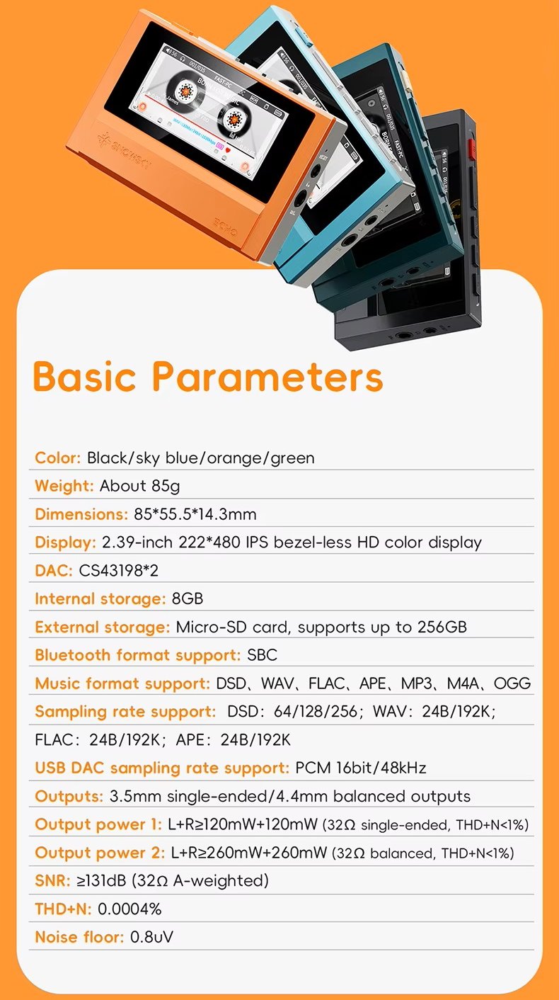 The ECHO comes with 8GB of internal storage and supports micro-SD cards up to 256GB. Easily store thousands of lossless tracks and enjoy your high-quality library on the go.