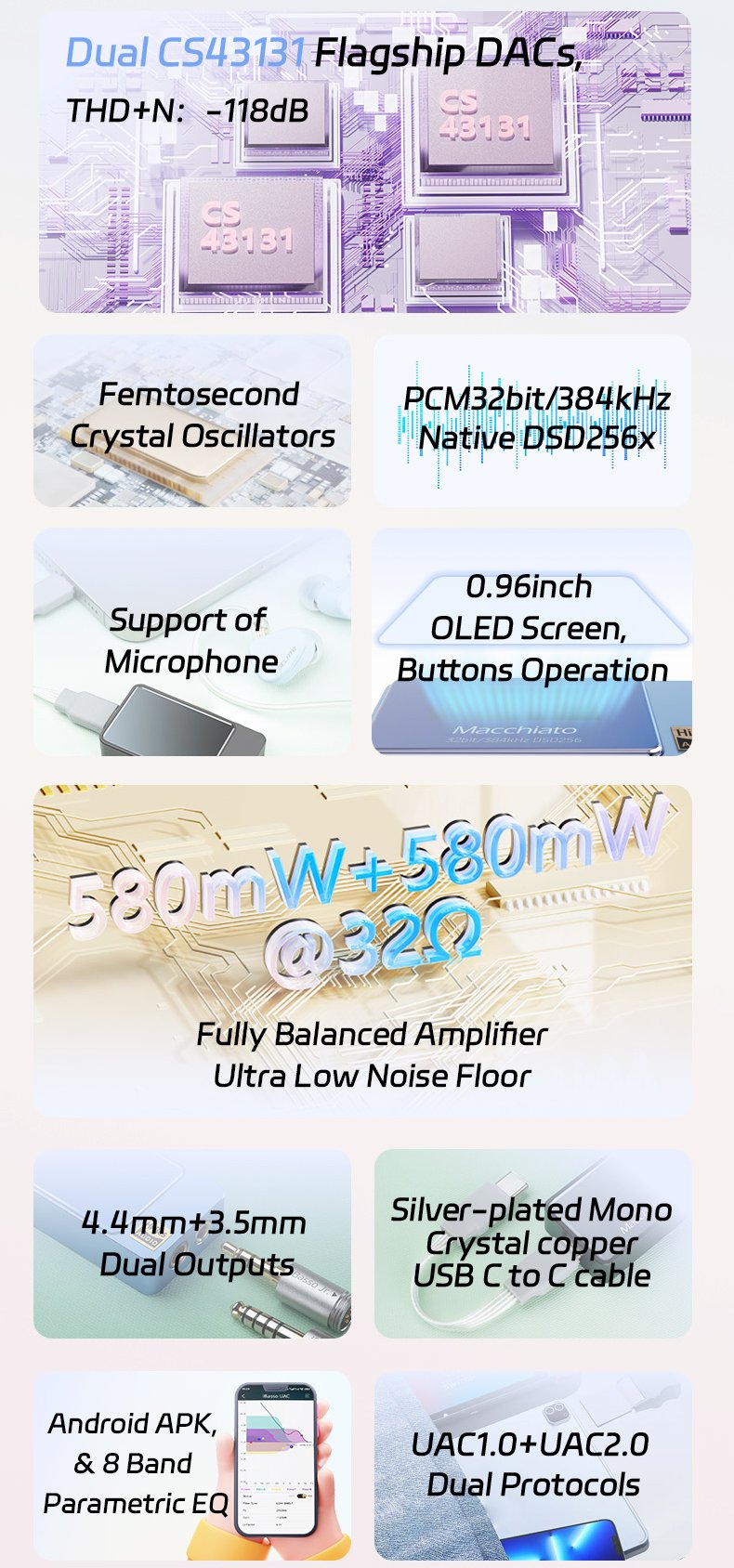 Experience unparalleled audio clarity with the Macchiato’s dual CS43131 flagship DACs, which deliver exceptional tuning and sound precision. Equipped with advanced femtosecond oscillators, it reshapes digital timing to minimise jitter and distortion, ensuring every note is crystal clear. Whether it’s the subtle vocals in pop tracks or the intricate layers of classical compositions, Macchiato faithfully reproduces rich details and musical nuances. Macchiato brings your music to life, bringing the joy of the performance to you whenever you want.