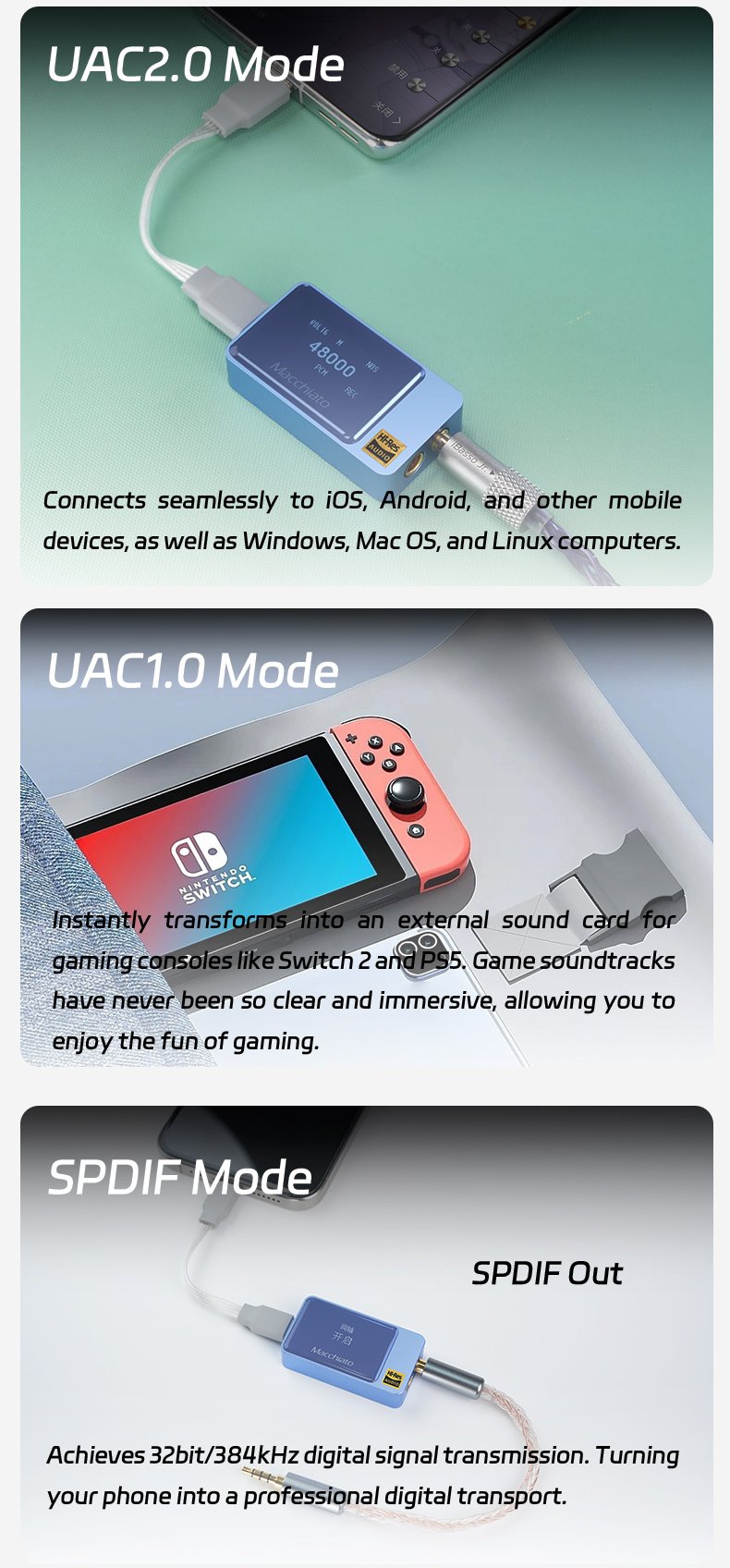 Macchiato is the Swiss Army knife among dongles — UAC2.0 and UAC1.0 protocols can be switched at will, ensuring broad compatibility across multiple device platforms. The 3.5mm interface also supports SPDIF output.
