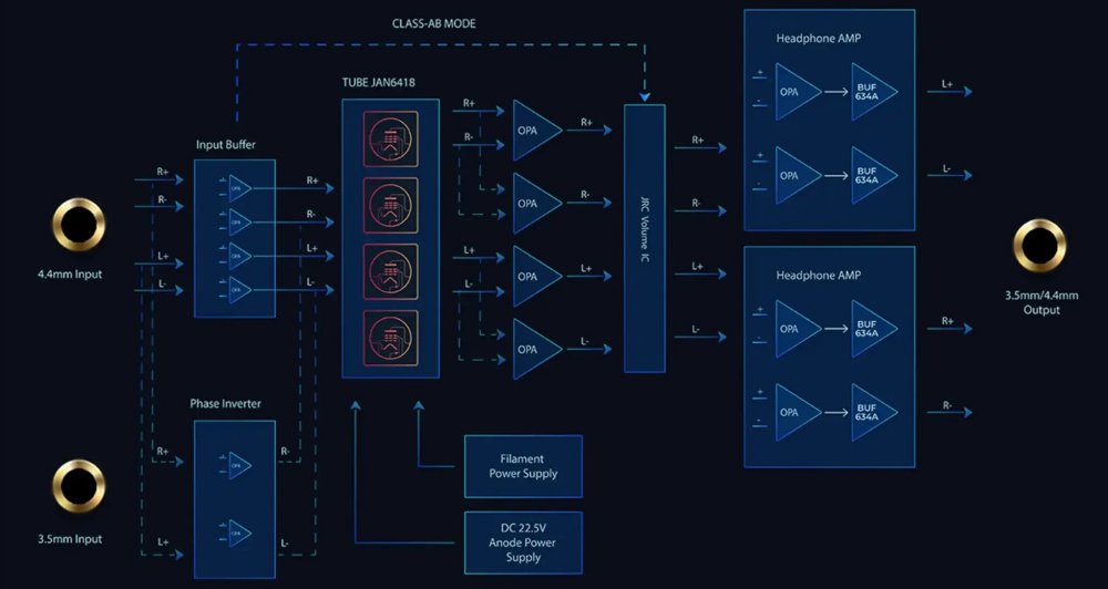 The PB6 supports both Tube and Class AB dual output modes. In Tube mode, four JAN6418 tubes serve as the amplification cores, delivering a delicate, rich, warm, and smooth sound, showcasing the exceptional characteristics of vacuum tubes. In Class AB mode, the PB6 employs a classic OP+BUF headphone amplifier circuit, utilising four BUF634A for current amplification, which offers enhanced resolution and excellent dynamic range.