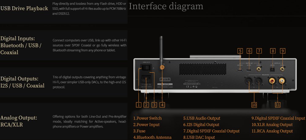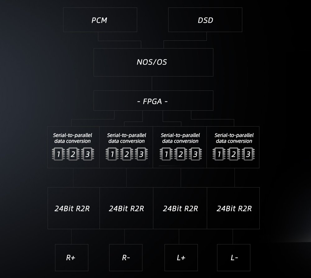 • FPGA-assisted I2S output with 10 pinout modes, offering Native DSD transport