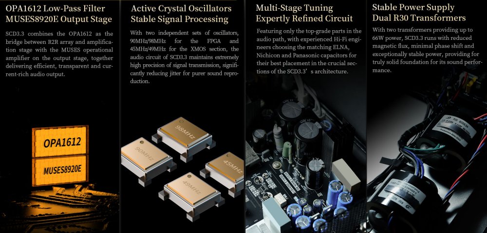 The SCD3.3 features dual active crystal oscillators—90/98 MHz for the FPGA and 45/49 MHz for the XMOS section—ensuring minimal jitter and precise signal transmission. Multi-stage tuning with top-grade ELNA, Nichicon, and Panasonic capacitors optimizes audio paths. Dual R30 transformers provide 66W of stable, low-noise power for consistent high-fidelity performance.