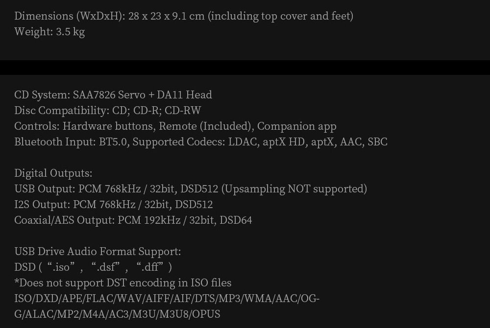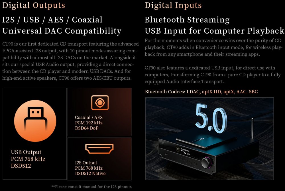 High-resolution output support extends up to PCM 768kHz and DSD512 via USB and I²S, with additional support for professional-grade AES and coaxial outputs. Beyond disc playback, the CT90 also accepts USB digital input and Bluetooth reception, allowing it to function as a versatile digital interface and central hub for modern audio systems.
